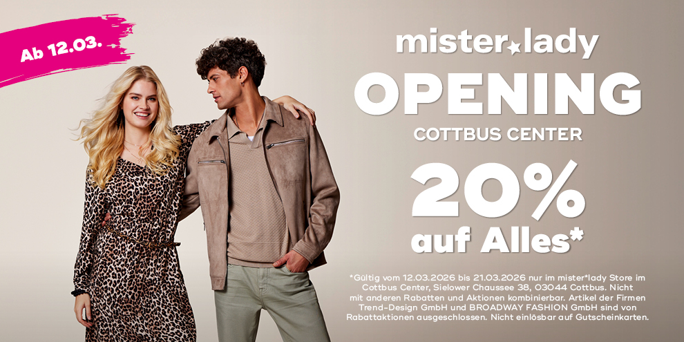 *Gültig vom 12.03.bis 21.03.2026 nur in mister*lady Store im Cottbus Center, Sielower Chaussee 38, 03044 Cottbus. Nicht mit anderen Rabatten und Aktionen kombinierbar. Artikel der Firmen Trend-Design GmbH und BROADWAY GmbH sind von Rabattaktionen ausgeschlossen. Nicht einlösbar auf Gutscheinkarten.